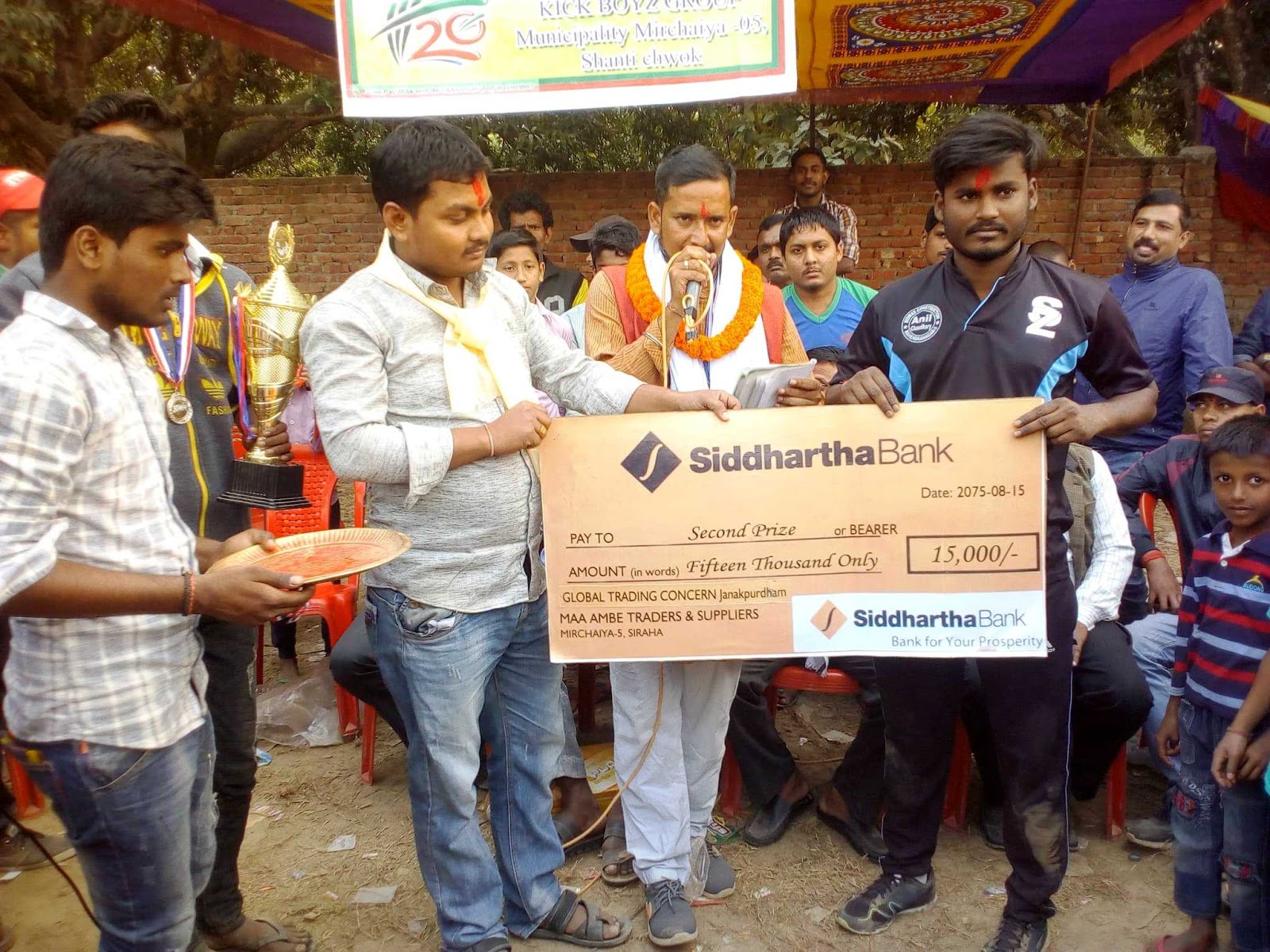 मिर्चैया नगरपालिका बडा नं. ५ स्थित मोहन माबिको मैदानमा भएको खेलमा बिजेता टिम सिरहा एकेडेमीलाई मिर्चैया नगरपालिकाका मेयर श्रबण कुमार यादबले २५ हजार रुपैया नगद र ट्रफी प्रदान गरेका थिए । त्यसैगरी उपबिजेता टिम महेन्द्रनगरलाई माँ अम्बे ट्रेडर्स एण्ड ग्लोबल ट्रेडिङ मिर्चैयाका संचालक लालबाबु साहले १५ हजार नगद र ट्रफी प्रदान गरेका थिए ।