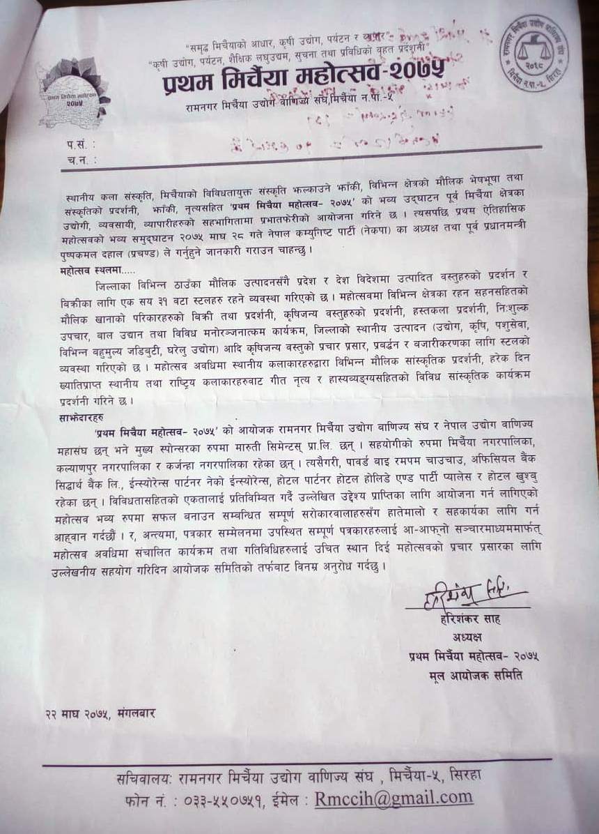 “समृद्ध मिर्चैयाको आधार–कृषि, उद्योग, पर्यटन र व्यापार” भन्ने मूल नारा सहित मिर्चैया नगरपालिका वडा ६ स्थित यहि माघ २८ गतेदेखि फागुन ७ गतेसम्म संचालन हुने महोत्सवको समुद्घाटन नेपाल कम्युनिष्ट पार्टी (नेकपा) का अध्यक्ष तथा पूर्वप्रधानमन्त्री पुष्पकमल दहाल (प्रचण्ड) ले गर्ने तय भएको समेत उनले बताए ।