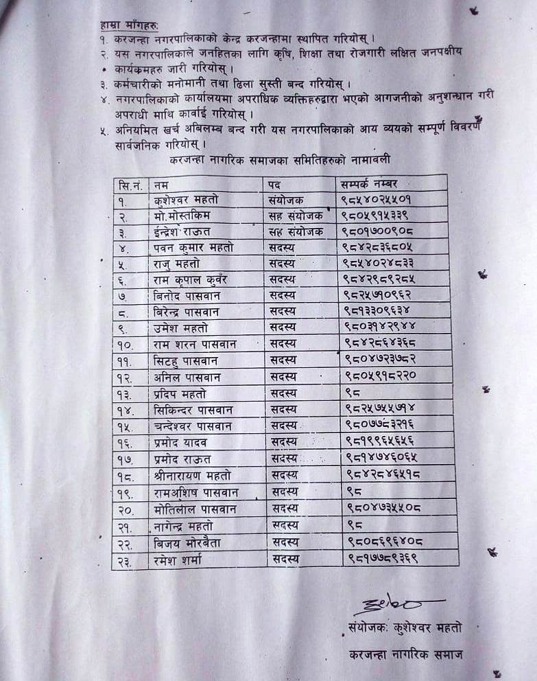 समाजले कर्जन्हा नगरपालिकाको केन्द्र कर्जन्हा बजारमा राख्नुपर्ने, नगरपालिकाकोे जनहितका लागि कृषि, शिक्षा तथा रोजगारी लक्षित जनपक्षीय कार्यक्रमहरु जारी गर्नुपर्ने, कर्मचारीको मनोमानी तथा ढिलासुस्ती बन्द गर्नु पर्ने, नगरपालिकाको कार्यालयमा अपराधिक व्यक्तिहरुद्धारा भएको आगजानीको अनुसन्धान गरेर अपराधीलाई कार्बाही गर्नुपर्ने र अनियमित खर्च अबिलम्ब बन्द गरी नगरपालिकाको आय–व्ययको सम्पुर्ण विवरण सार्वजनिक गर्नु पर्ने माँग राख्दै मेयर पासमानलाई ज्ञापनपत्र बुझाएका छन् ।