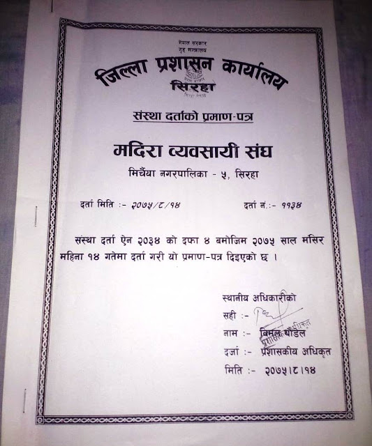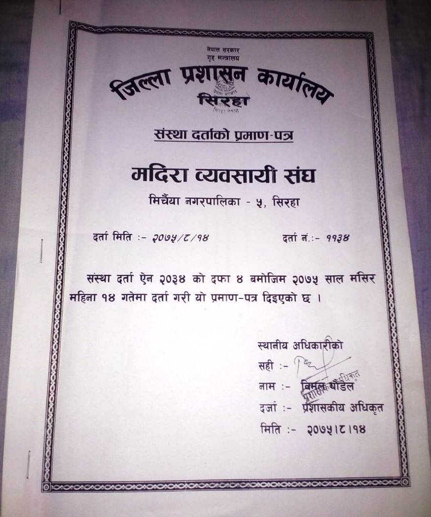 राम नारायण पंडित, सिरहा, २१ म्ंसिर । मदिरा व्यवसायी संघ मिर्चैया, सिरहाको पहिलो बैठक सम्पन्न भएको छ । यहि मंसिर १४ गते जिल्ला प्रशासन कार्यालय सिरहामा दर्ता भएको मदिरा व्यवसायी संघको अध्यक्षमा रमेश कुमार श्रेष्ठ, प्रथम उपाध्यक्षमा बिजय कुमार साह, द्धितीय उपाध्यक्षमा कैलाश कुमार साह, महासचिबमा प्रदिप चौधरी, सचिबमा सरोज कुमार साह, कोषाध्यक्षमा बिपिन साह रहेका छन् । त्यसैगरी सदस्यहरुमा रेखा कुमारी तमा¨, अमरदिप कुमार साह, प्रदिप कुमार मंडल, निलेश कुमार श्रेष्ठ र सुमित्रा लामा रहेका छन् । सदस्यमा दुई जनाको नाम अर्को बैठकले तय गर्ने निर्णय भएको संघले जनाएको छ ।